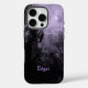 A custom iPhone case with purple grung type letters and a spooky Halloween sky with misty trees along a dark haunted road, gothic ravens and a cloudy full moon with a purple mist.
