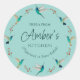This pretty customisable sticker is featuring a watercolor wreath of hummingbirds and botanical branches on an aqua blue background. The font size and font style can be changed by clicking on "Edit using design tool". All hummingbird images are taken from original watercolors by C. Dobbins.