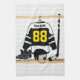 A unique and fun sports design with a personalised ice hockey jersey hanging in a locker room with a helmet, ice skates and a hockey stick. The jersey can be fully personalised with the number and name of your choice to make a great gift for any ice hockey fan, ice hockey coach or ice hockey player.