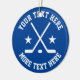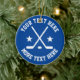 Custom ice hockey sports Christmas tree ornament. Sporty design with athletic typography template, crossed hockey sticks, puck and stars. Add your own greeting, funny quote, family name, team name etc. Cool gift idea for friends, family, player, mum, dad, coach, kids, boy, girl, trainer, coworker etc. Themed x-mas decoration. Includes sparkly gold string. Happy Holidays! Blue or custom colour.