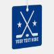Custom ice hockey sports square Christmas ornament for kids and adults. Upload your own picture on the back to create your a unique x-mas tree ornament. Create one for hockey players, kids, dad, husband, friend, boyfriend, sports coach, team, mates, boss, coworker, employee, brother, uncle, grandpa, boy, girl etc. Create your own Holiday decorations for him. Blue or custom colour with personalised text. Double sided with string. Crossed hockey sticks and puck logo with stars.