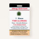 Custom ID Identification Allergies Alert Card Badge great for someone who should wear it - Child or Adult.  It will help the person who has allergies to remember what they have and/or give it to the restaurant or home owner where they may be eating. Sometimes it is hard to remember all you are allergic to when you are not home. Replace information on this alert card with very important information you know. Write your more information on the back of the badge.