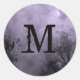 A custom monogram sticker with a grungy typewriter-style letter and a spooky Halloween sky with misty trees along a dark haunted road, gothic ravens and a cloudy full moon with a deep violet tint. Customise It to change your fonts, sizing and more, even save your design for later.
