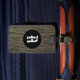 This luggage tag design features a rustic pattern with a brown wood like appearance. It also features a customised initial letter within a dark circle on the front, and personalised contact details on the back.