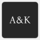 These custom wedding or event sticker labels feature a clean, modern, and elegant design. Sample initials of the bride and groom are printed in the center in a sophisticated white font. The background is a solid black. You can personalize the stickers to include your own custom initials or other text of your choice.