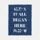 A beautiful way to remember where it all began by customising this design with your own coordinates. Search for your coordinates on a mapping site and simply customise the text, latitude and longitude numbers to create your own personalised design. A warm navy blue colour in the background making it ideal for any home decor.