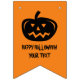Custom carved pumpkin head Halloween party bunting banner flags. Orange and black pumpkin face carving design with personalised greeting message. Scary party supplies and DIY accessories for Happy Halloween night and trick or treat. Fun decor for home, office, corporate business, shop, store, surprise event, Birthday, wedding, baby shower, housewarming, anniversary, celebrations, gatherings, reunion, costume parties etc. Add your own text to this do it yourself template. Haunting typography template. Make your own flags on a string. Nice for kids and adults. Change quantity to get the cheap bulk discount price.