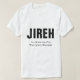 Simple modern Christian T-shirt with black typography that reads JEHOVAH JIREH - ALL-SUFFICIENT ONE WHO ALWAYS PROVIDES, which is based on the Bible verse from Genesis 22:14. The 'Jehovah' is placed vertically within the J of 'Jireh'. The subheading is CUSTOMIZABLE so you can personalise with your name or wording of your choice (or delete).