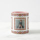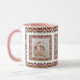 Custom Jolly Autumn Fall Winter Christmas Pattern Photo Picture Tea Coffee Mug. In traditional autumnal colors of bright pink red, green, and purple; in a merry multicolour, maximalist, modern geometric pattern. For winter warmer drinks and cheerful hot chocolate on cozy winter nights in. Change the three photos to your own pictures to celebrate joyful family memories. Buy as a budget friendly festive keepsake tableware gift for her or grandparents.