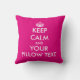 Custom Keep calm and your text dorm room throw pillow. Double sided design with customisable colours. Black and white or neon pink. Cute decorations for students bed, sofa or chair. Make your own funny keep calm and carry on parody design. Customisable vintage typography template with crown. Personalizable background colour. Create your own humourous spoof decor cushion. Keepcalm spoof examples: Keep calm and party on. Keep calm and love me. Keep calm and study on.