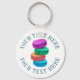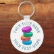 Custom keychain with French macaron cookie drawing. Cute key chain with personalised text and colourful illustration. Fun Birthday gift idea for friends, family, coworker, colleague, kids etc. Pink, green, orange and blue colours. Pasty sweets in different flavours with elegant text template.