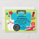 This custom bowling birthday party invitation features a big bowling bag, bowling pins, a bowling ball and bowling shoes.