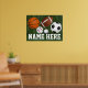Green grass with assorted sports balls, Custom Kids Name Allstar Sports Wall Art Poster. Add your child's name to this personalised wall poster print. features basketball, soccer ball, baseball, football. Cute kids or baby room decor for sports theme
