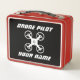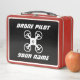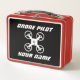 Custom kid's lunch box for little drone pilot. Retro style metal lunch box with name of child. Custom gift ideas for little boys and girls going to kindergarten and preschool. Classic metallic lunchbox with handle. Cute Birthday or Holiday gift idea for son, grandson, daughter, nephew etc. Add your own name, team, monogram initials or funny quote. Available in many colours. Sporty cursive typography. Custom background colour.