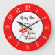 A custom clock with script letters reading Kitchen Magician in sparkly letters in black, red and yellow, and a magical cooking girl. The retro numbers are white with a black outline surrounding the art on a red background. Customize this clock to change background colors, change elements and more.