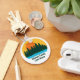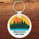 Beautiful family lake vacation keychain featuring the pretty blue waters under the forest of trees and cool orange sunset. Cute camping trip keepsake souvenir for your nature outing or wilderness group.