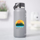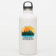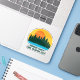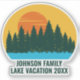 Beautiful family lake vacation laptop or water bottle sticker featuring the pretty blue waters under the forest of trees and cool orange sunset. Cute camping trip keepsake souvenir for your nature outing or wilderness group.