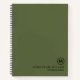 Custom large spiral hardcover notebook features a simple monogrammed design in olive green with black accents. Personalised name presented in the lower right-hand corner in stylish simple font with a complimentary minimal monogram medallion.