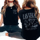 The front print showcases sleek black text with phrases like "Lucky in Love Bridesmaid" and "Las Vegas Social Club," adding a touch of elegance and unity to your group's attire. On the back, a vibrant graphic design highlights a custom "Vegas Before Vows" theme, making this shirt not just apparel, but a cherished keepsake of your memorable weekend.