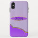 Stylish case featuring a lilac diagonal scalloped detail, bordered by a thin golden line and a golden bordered lilac tag on lavender stripes background. Personalise it by adding your own name, changing font style, font size and font colour as you wish.