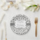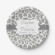 Chic, modern, pretty wild animal big cats leopard print paper plates in white and grey with a grey stripe and white edged with grey banner that you can personalise with the wedding couple's names and wedding date!