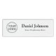 Personalised name tags with custom logo featuring your name and title printed in black on a white background.