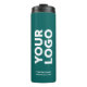 Advertise with your business logo, slogan, company name, website or other custom text on a branded teal thermal tumbler. Replace the sample logo and text with your own in the sidebar. White or light coloured logos will work best with the dark blue-green background. If you want the background colour to show through your logo, upload a version with a transparent background. Your brand symbol can be any shape. This is eco friendly swag your employees, customers and clients will keep and appreciate!