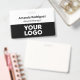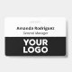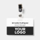 Make your business look professional with custom name badges featuring your company logo, employee name, and job title. Customize it in the sidebar. The staff person's name appears at the top in bold black text with the job title or custom text below it in a black italic font on a white background. The bottom half of the badge features your logo on a black background. This design works best with white or light colored logos.