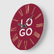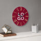 This simple yet sophisticated custom wall clock features a dark red or burgundy colored background with a sample company of business logo placed in the center. You can personalize the clock to add your own company or business logo, or other custom image. The hours are printed in a gold foil design, Roman numeral pattern.
