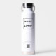 Advertise with your business logo, personalised QR code, and company name and website or other custom text on 2 sides of a branded white water bottle. Replace the sample logo, website URL, and text with your own in the sidebar. Your logo can be any colour and any shape. This is eco friendly swag your employees, customers and clients will keep and appreciate!