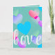 The design features colourful hearts and script typography of words of love suitable for celebrating Valentine's Day or any of the couple's special days. The front cover script, which reads "love" as well as the inside message which reads "Happy Valentine’s Day to the one who forever has my heart." are customisable. Colours featured in the hearts are shades of blue, red, pink, purple, and green.