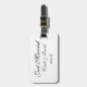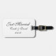 Custom luggage tag shown in black/white with Just Married text. Customise this tag and change names and date to yours. You can even change colours.