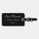 Custom luggage tag is shown in black and white with Just Married text and sample names, customise this tag and change the sample names and date to yours with this template.