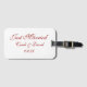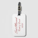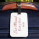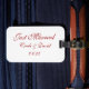 Custom luggage tag is shown in a red and white style with Just Married text on front and a card slot on back.