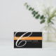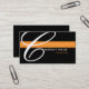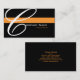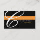 A black background with an orange stripe. Replace the large "C" with the first letter of your company's name for a custom look. All of your contact information is on the back of the card. Font and font size and colour can be changed.