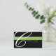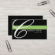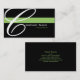 A black background with a green stripe. Replace the large "C" with the first letter of your company's name for a custom look. All of your contact information is on the back of the card. Font and font size and colour can be changed.