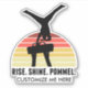 This cool mens gymnastics sticker features a male gymnast in a handstand on a pommel horse in front of a beautiful sunset. The funny quote reads RISE SHINE POMMEL. Customise with a gym or name.