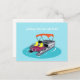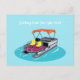Spending your vacation lounging aboard your pontoon boat? Send your own personalised pontoon boat postcards to family and friends. These postcards feature a bright and colourful illustration of a pontoon boat against a light blue background with your own greeting at the top in script lettering. The blank back's ready for your own handwritten message or a custom printed message or illustration.