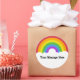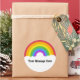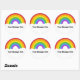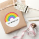 This round sticker is ready to be customised with your own message, add a name or your own special saying. It features a retro style illustration of a rainbow in bright colours with your text in bold black lettering in the white clouds below.
