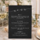This wedding menu sign features refined script lettering paired with classic serif typography on a black background for a timeless, elevated look. The minimalist layout highlights each course clearly while adding a sophisticated design element to your reception space. Ideal for modern, formal, and black-and-white weddings, it complements elegant table settings and signage. A polished way to display your menu while maintaining a cohesive, understated aesthetic.