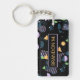 Durable rectangular key chain with classy, fun and contemporary teal, violet purple, orange, and lime green coloured abstract geometric triangles, polka dots and half circles mosaic pattern on a black background. With room to customise or personalise with name of your choice. Stylish, modern and cool customisable style for the fashionable man. To attach to your briefcase or backpack zipper, to hold loyalty rewards or membership cards, or of course... to hold keys! What ever keys you want to stay in place and hold together, a unique personalised key ring will make it look nicer and also easier to recognise as your own set. Click on our store name to check out more unique key holders with other custom designs.