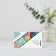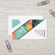 A modern and minimalist business card design featuring a bold, diagonal stripe that divides the card into two sections. The top section is filled with abstract geometric shapes in vibrant colours, creating a visually interesting and eye-catching background. The bottom section contains the contact information in a clean and professional font.