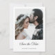 This simply chic photo wedding save the date flat card template features a striking minimalist, modern design. Please browse our shop for a version of this design with Save the Date text in gold, and also in a postcard format! The front features your first names under your favorite photo and a 'save the date' message conveyed in an elegant looping cursive handwriting script. Its flourish and flow is accentuated by the 'less is more' aesthetic of this design. This save the date design element is included on both sides and can't be altered, though you might choose to delete it on the back for an even simpler look. And on the back you can of course in addition to replacing our sample info with your own, delete text fields that you don't need, or change the wording, as well as change font, size and color. You might for example change 'ARE GETTING MARRIED' to 'ARE TYING THE KNOT', or something else, or you might delete the sample website info without replacing it with your own website info, or you might replace it with a different message entirely. When you edit for your own first names on the back, you might also choose to include your last names. The default color for your names on the front is black and the default colors for the text on the back are black and a slightly softened black. The default background color on both sides is set as transparent, to let the paper color simply serve as the base tone. But you can edit this and change the look of one or both sides in this regard as well to suit your style. Customize this elegant modern minimalist wedding save the date flat card template with your photo and your inspiration and make it uniquely yours!