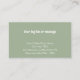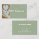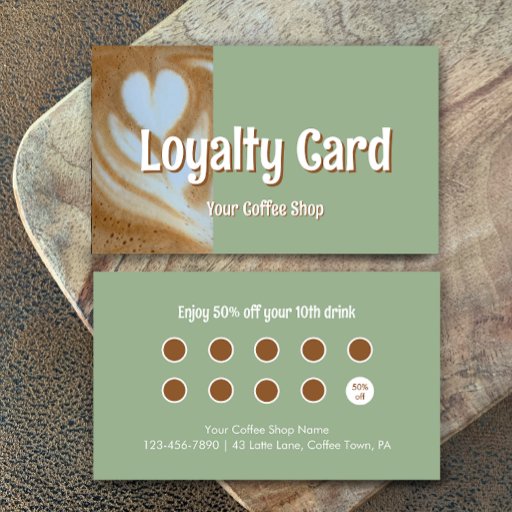 Add your custom text to this business card template. The modern stylish script is editable. On the front is a photo of coffee latte art in a heart shape. If you prefer you can replace this photo with your own photograph. This trendy sage or eucalyptus green and white card would be great for a coffee shop. Add the name of your cafe or coffee house. On the back you can add custom text and you address, hours, and more.