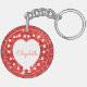 This key chain features a coral glitter bokeh background with a dot encircled white heart centre and a first name and initial letter monogram. Personalise the text fields with a first or last name and initial, remove one or both text or click customise to select a typeface style, size, and colour you prefer. The text change will occur on both sides.