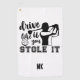 Funny golf towel personalised with your monogram/initials. Text says, "Drive it like you stole it."