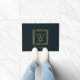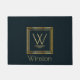 Monogram and name in faux gold - golden yellow coloured minimalist font set on a golden flourish and framed in an intricate golden geometric frame. Set on solid black pearl - a deep dark rich blue. Use the template to personalise with your monogram initial.