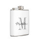 Personalised monogram bridal party drink flask with elegant script typography. Customisable black and white colour. Cool wedding / bachelor party gift idea for bride and groom / groomsmen and bridesmaids. Personalise it with your own name and monogram initial letter. Alcohol / Drinking present for bachelorette, girls weekend, boys night out etc.. Custom background colour. Chic font.