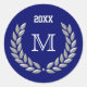 Custom Monogram Light Grey Laurel Wreath on Blue Classic Round Sticker
