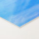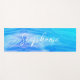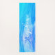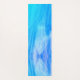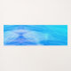 This unique yoga mat is decorated with a swirling pattern in shades of blue and elegant white typography.